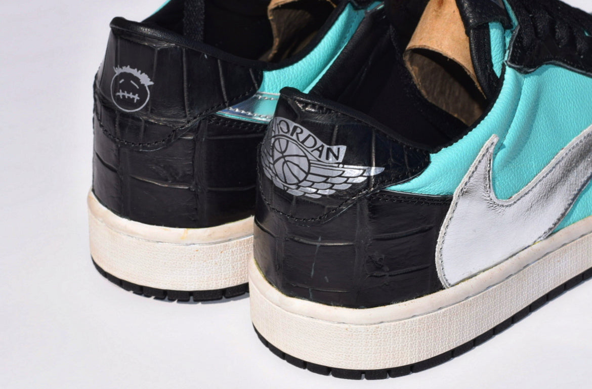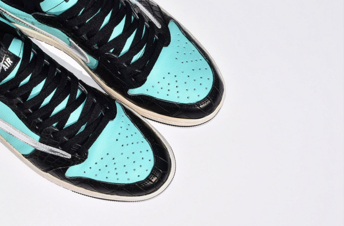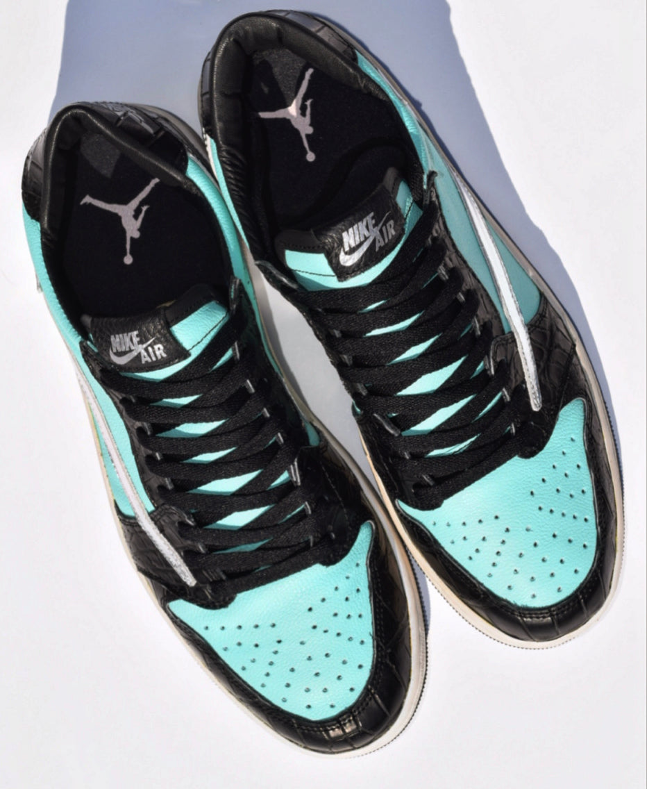 Feature Tiffany blue pebbled leather accented by a silver swoosh, wrapped in genuine alligator. All of which sits on top of a authentic black AJ1 outsole that has been aged to perfection. Production time for pairs are estimated to be around 10-12 weeks.